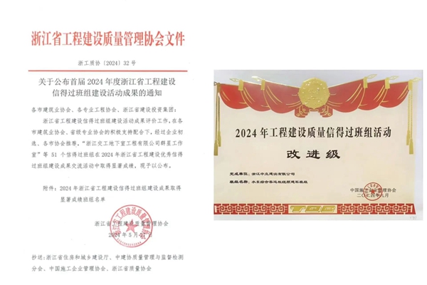 在2024年度工程建設質量信得過班組比賽中,我公司水東樞紐項目團隊獲得浙江省建設成果取得顯著成績班組和中國施工企業管理協會《2024年度工程建設質量信得過班組改進級》。
