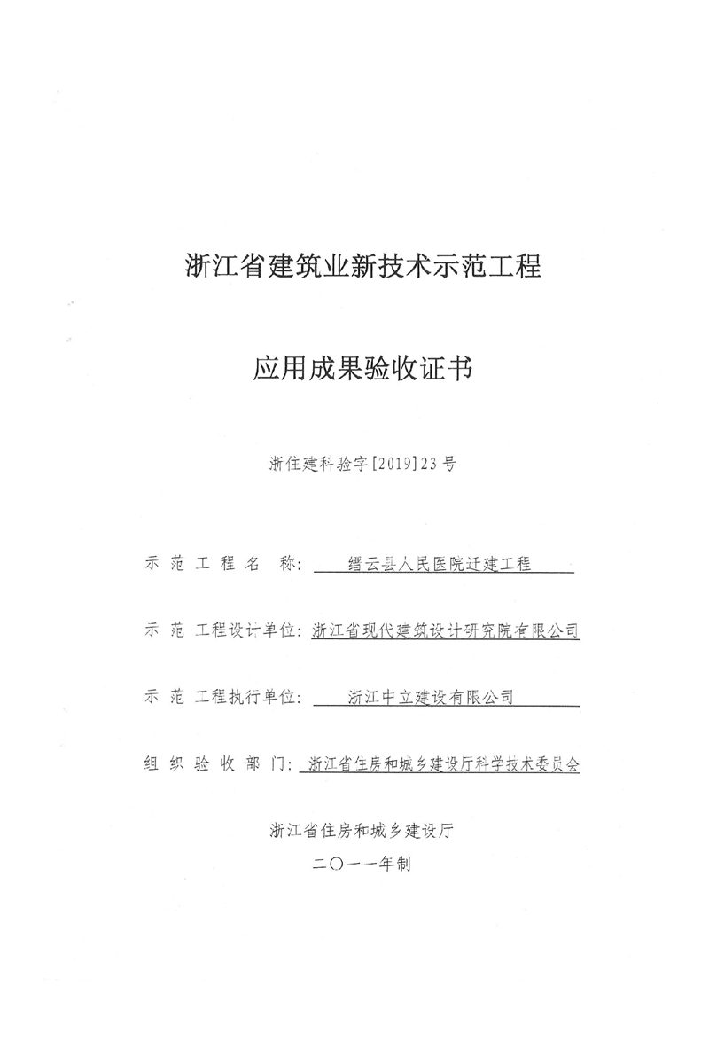 縉云縣人民醫院遷建工程榮獲 浙江省建筑業新技術應用示范工程