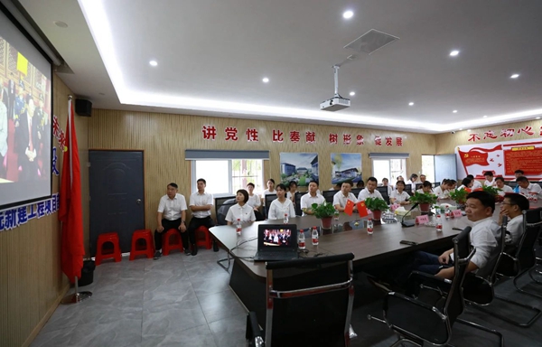 支部建在工地上!7月1日,公司黨支部書記鐘鳴、董事長周健帶領全體黨員、高層人員來到麗水電大蓮都學院新建工程項目,首先和項目工作支部全體黨員觀看慶祝中國共產黨成立100周年大會直播實況。